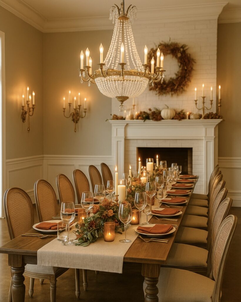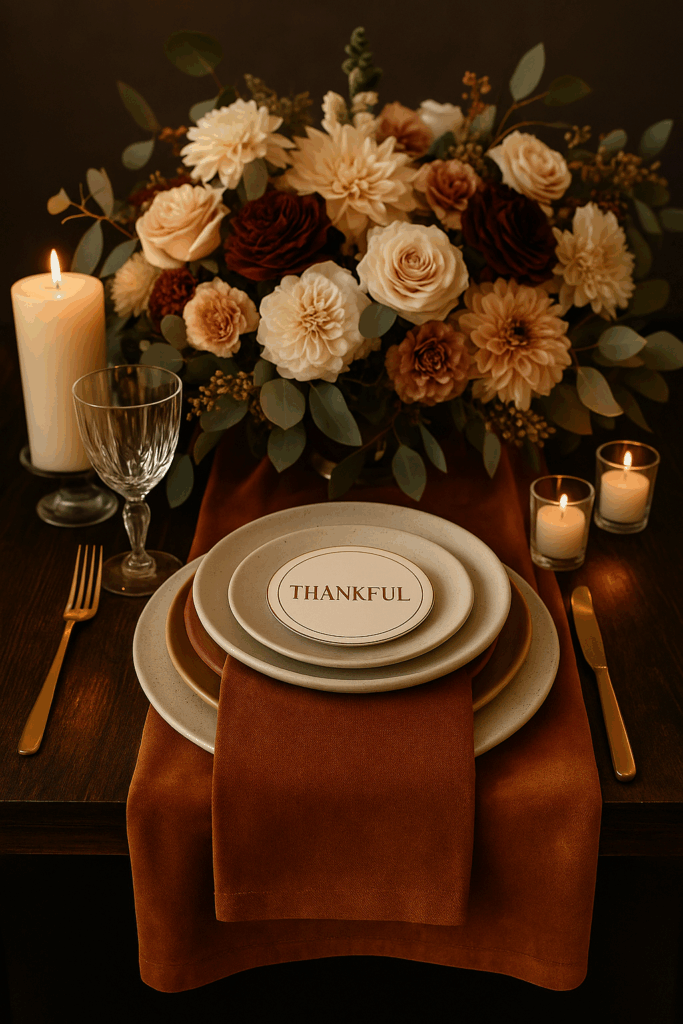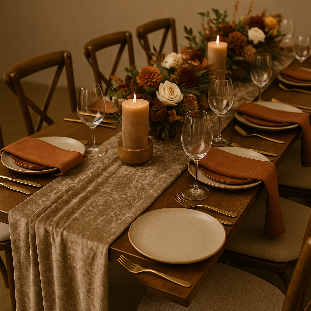 Velvet runners, linen napkins, ceramic plates, and wood details create a cozy yet elegant fall tablescape.